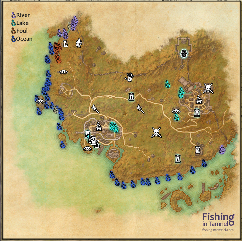 This map show fishing locations in the Gold Coast (Dark Brotherhood). All fishing spot pins are color-coded according to their water type using Votan’s Fisherman Addon.